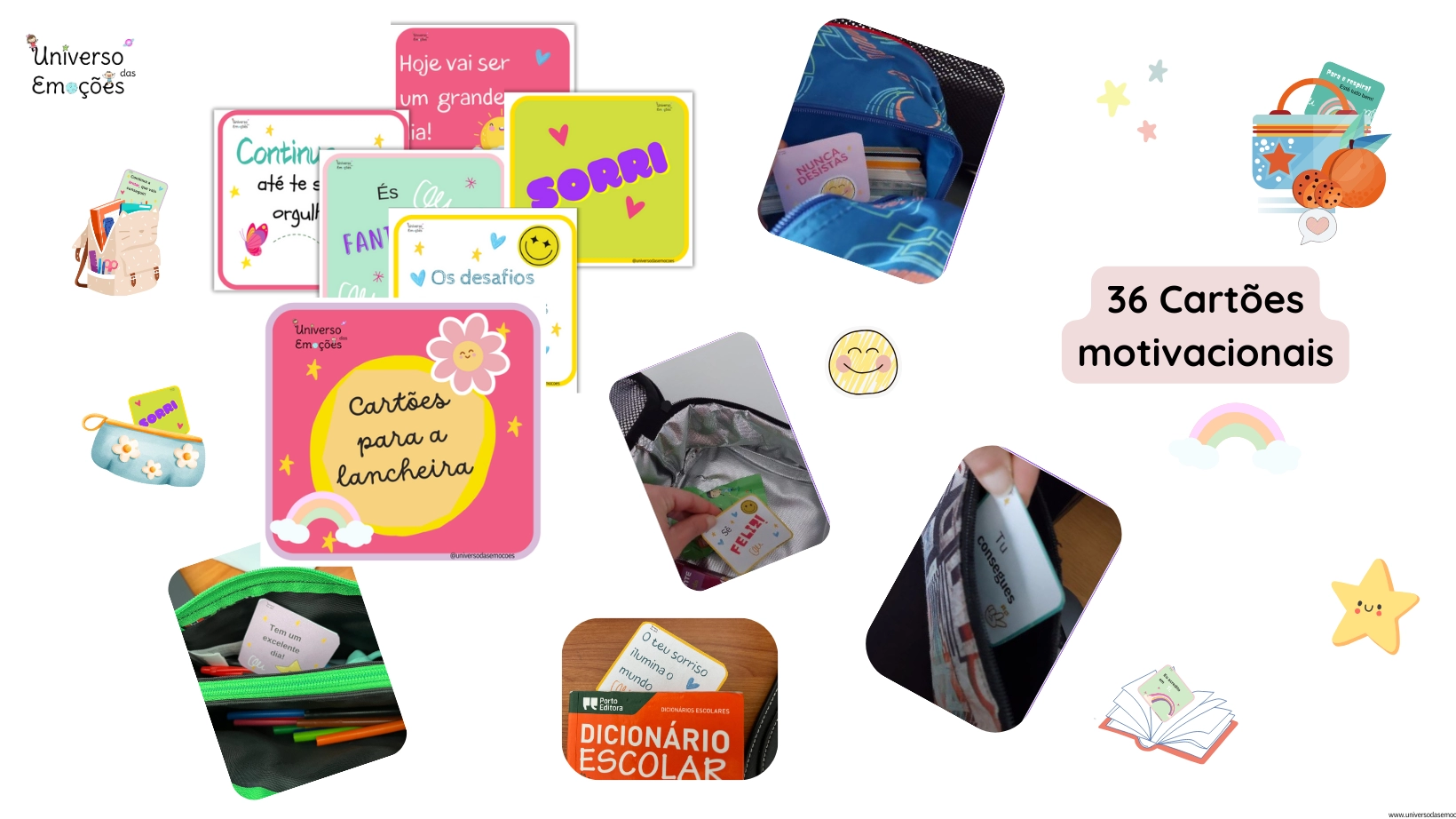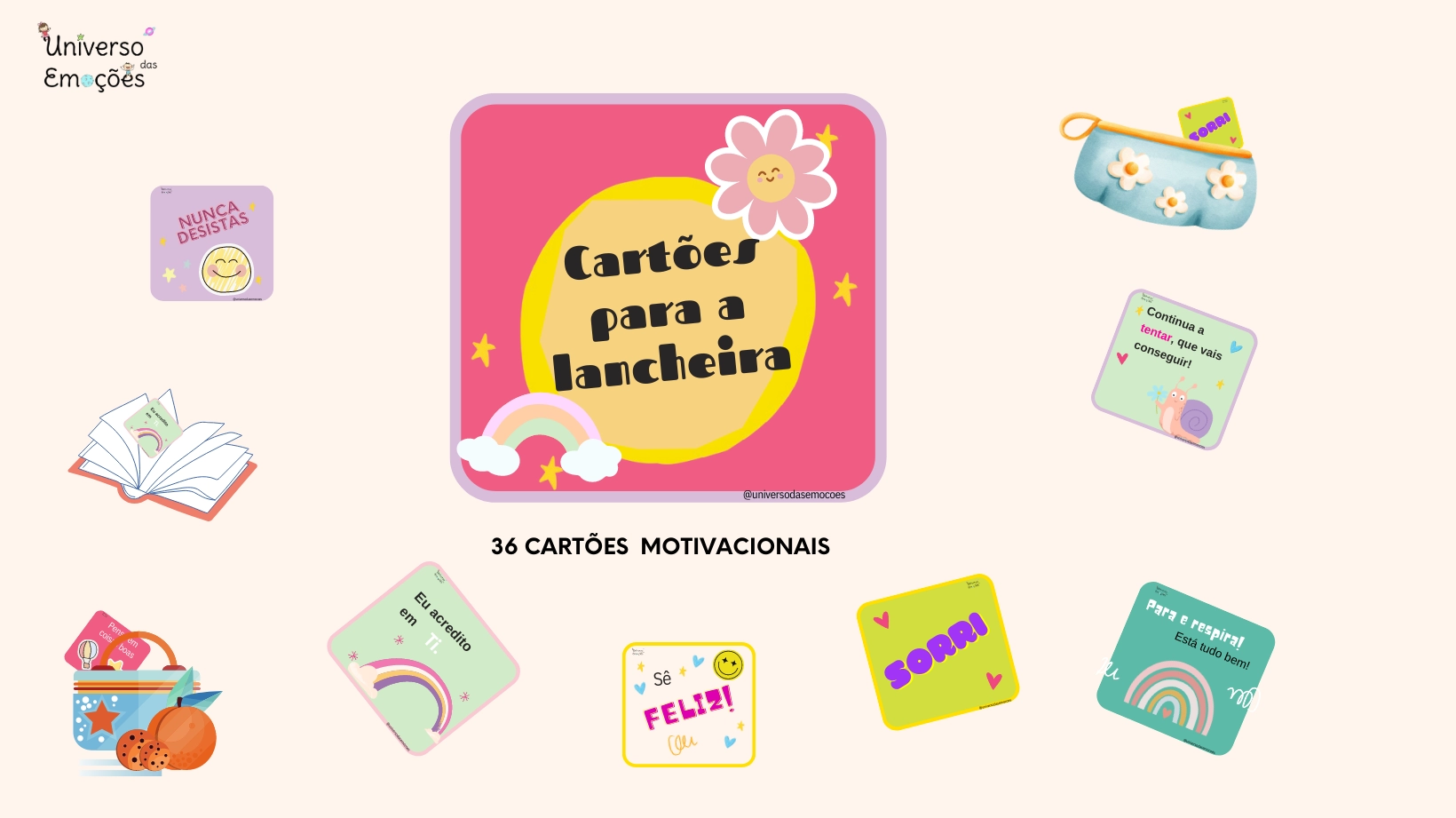 Inclui um conjunto de 36 cartões com frases motivacionais, para imprimir e colocar em locais onde as crianças possam encontrar inesperadamente - na lancheira, no estojo, na cama, no livro favorito ou no prato durante o jantar.