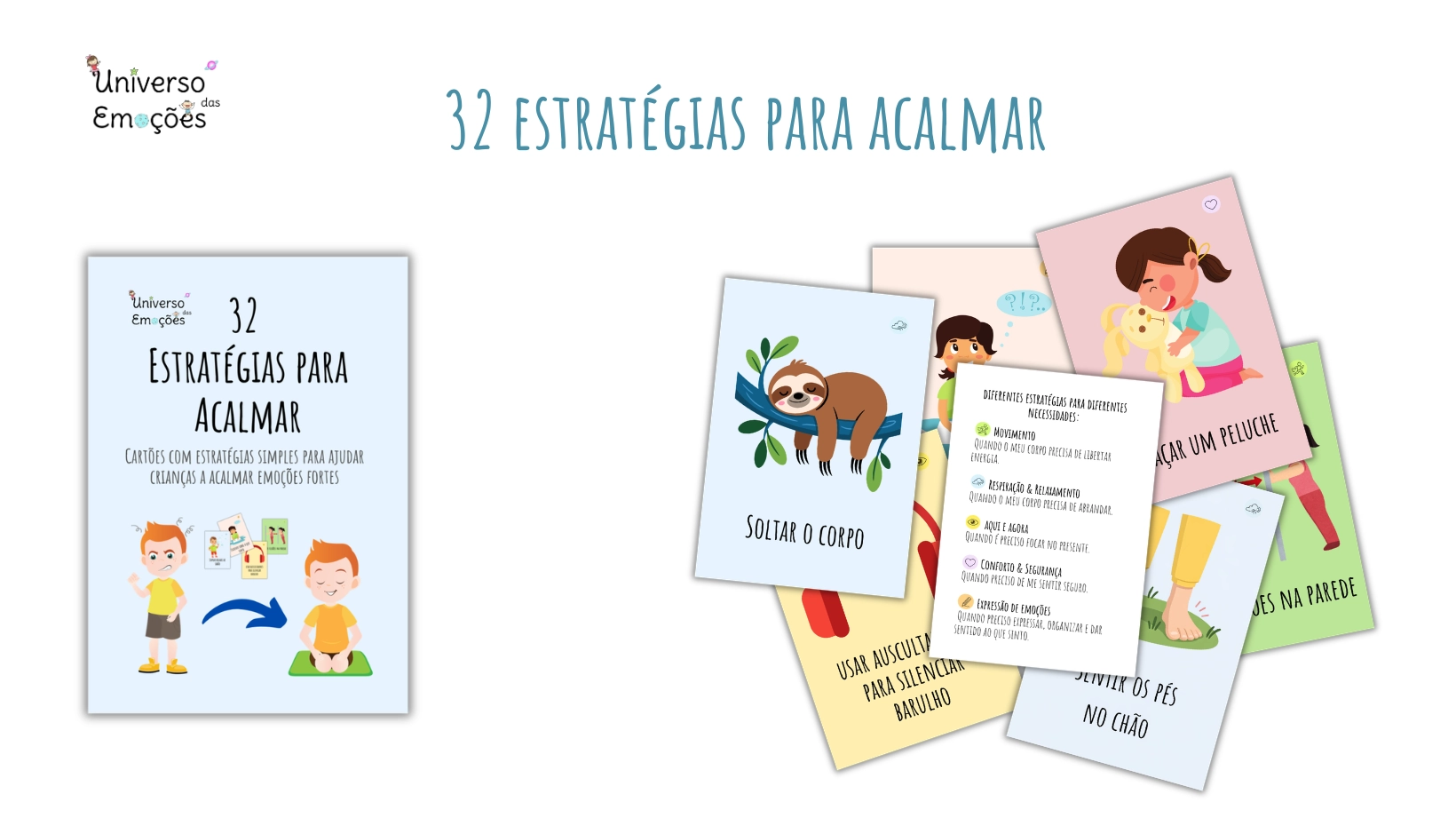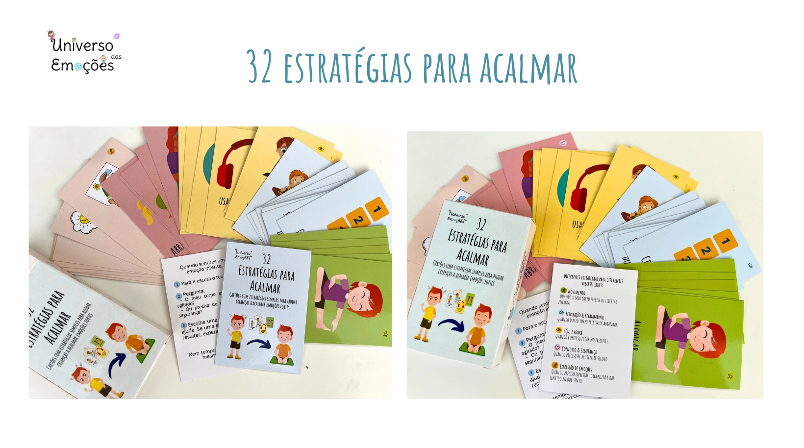 O baralho 32 Estratégias para Acalmar foi criado para ajudar crianças a reconhecer o que o corpo está a pedir e escolher, de forma autónoma, uma estratégia que as ajude a recuperar o equilíbrio.
